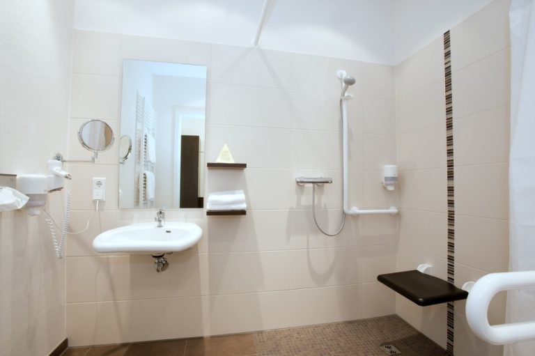 Die Breite des Bettes beträgt 95 cm, die Höhe etwa 48 cm. Der Bewegungsfreiraum im Badezimmer beträgt 120 x 120 cm. An beiden Seiten der Toilette befinden sich Haltegriffe. Die Dusche ist ohne Schwelle zugänglich und das Waschbecken kann unterfahren werden. Ein klappbarer Duschsitz und ein verstellbarer Spiegel sind ebenfalls vorhanden.