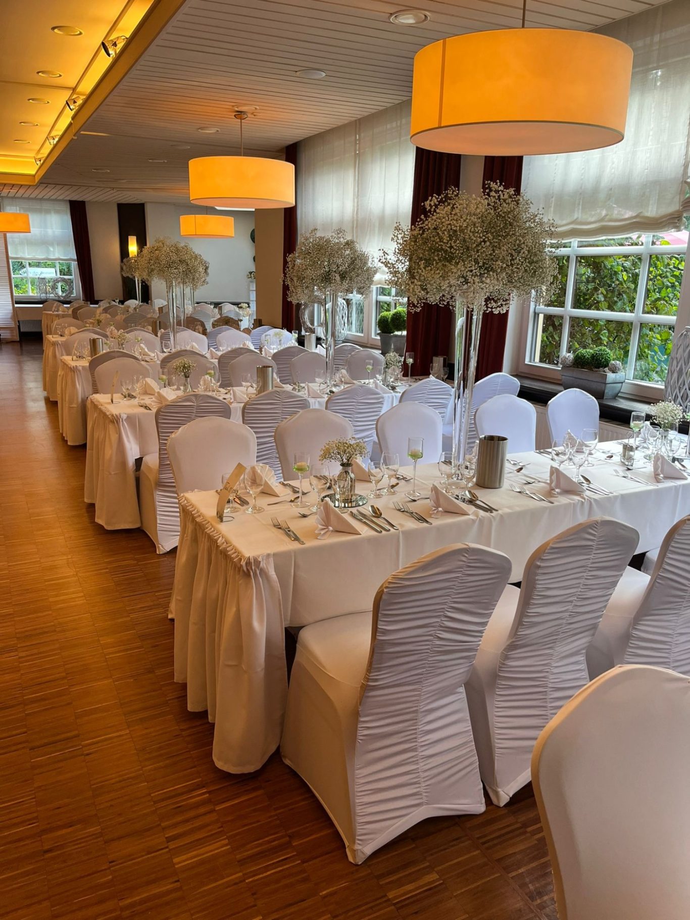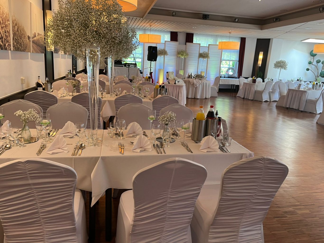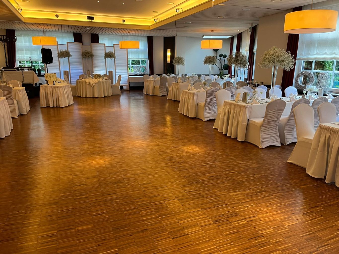 Ob Lichtdekoration an der Decke bis hin zu Blumenarrangements auf den Tischen, sowie Hussen,